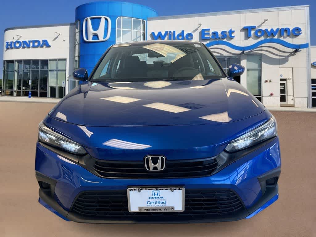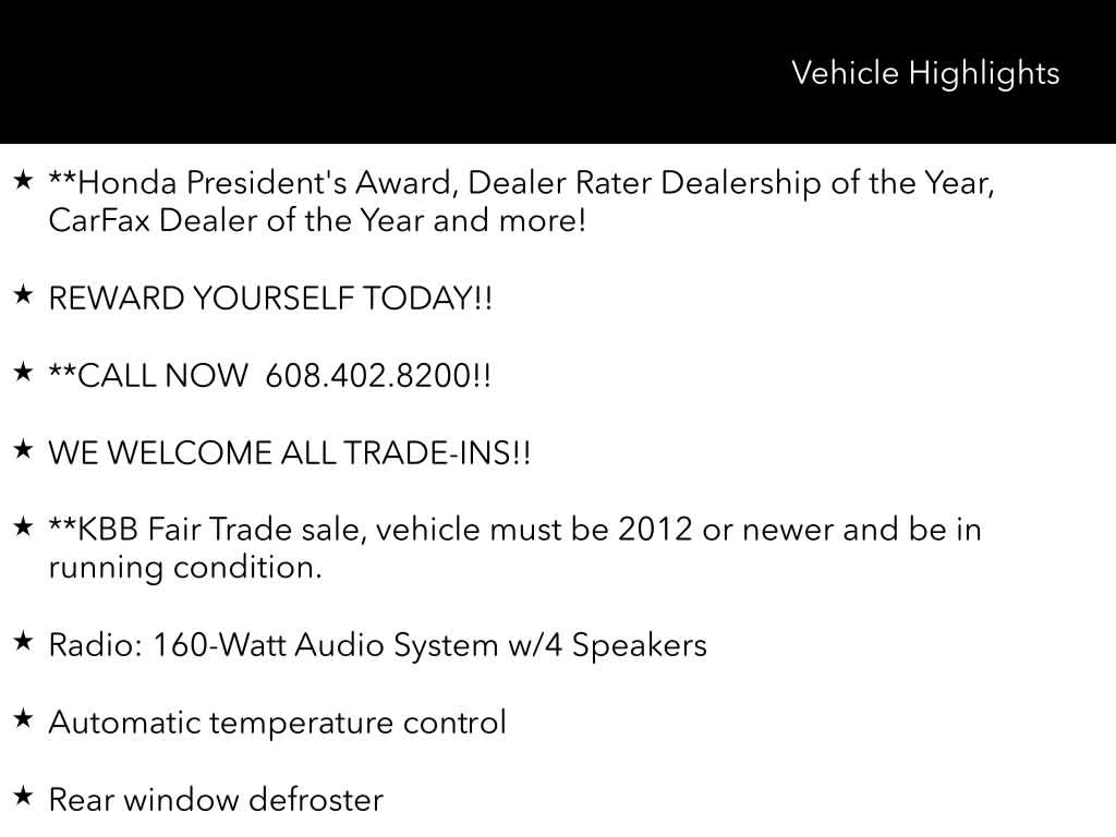 **Honda Presidents Award, Dealer Rater Dealership of the Year, CarFax Dealer of the Year and more!, REWARD YOURSELF TODAY!!, **CALL NOW 608.402.8200!!, WE WELCOME ALL TRADE-INS!!, **KBB Fair Trade sale, vehicle must be 2012 or newer and be in running condition., Besides many of the features just listed, this Honda Civic also may have many of the following;, HondaTrue Certified Certified, Black w/Cloth Seat Trim, Automatic temperature control, Dual front impact airbags, Dual front side impact airbags, Exterior Parking Camera Rear, Radio: 160-Watt Audio System w/4 Speakers, Rear side impact airbag, Rear window defroster, Steering wheel mounted audio controls, 16 Wheels w/Full Covers, 4 Speakers, 4-Wheel Disc Brakes, ABS brakes, Adaptive Cruise Control: Adaptive Cruise Control (ACC) with Low-Speed Follow, Air Conditioning, AM/FM radio, Apple CarPlay/Android Auto, Auto High-beam Headlights, Brake assist, Bumpers: body-color, Cloth Seat Trim, Delay-off headlights, Driver door bin, Driver vanity mirror, Electronic Stability Control, Emergency communication system: HondaLink, Four wheel independent suspension, Front anti-roll bar, Front Bucket Seats, Front Center Armrest, Front reading lights, Fully automatic headlights, Illuminated entry, Knee airbag, Low tire pressure warning, Occupant sensing airbag, Outside temperature display, Overhead airbag, Panic alarm, Passenger door bin, Passenger vanity mirror, Power door mirrors, Power steering, Power windows, Radio data system, Rear anti-roll bar, Remote keyless entry, Security system, Speed control, Speed-sensing steering, Tachometer, Telescoping steering wheel, Tilt steering wheel, Traction control, Trip computer, Black w/Cloth Seat Trim, Automatic temperature control, Dual front impact airbags, Dual front side impact airbags, Exterior Parking Camera Rear, Radio: 160-Watt Audio System w/4 Speakers, Rear side impact airbag, Rear window defroster, Steering wheel mounted audio controls.
