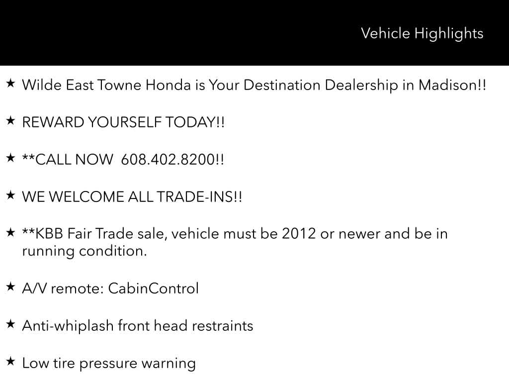The HondaTrue Certified program further enhances the value of this Odyssey Elite, providing you with a comprehensive 182-point inspection, a 24-month/100,000-mile limited warranty, and a host of additional benefits to give you the confidence and peace of mind you deserve.