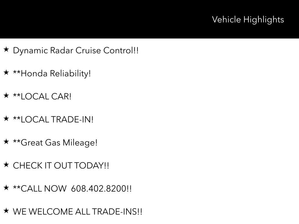 Wilde East Towne Honda is Your Destination Dealership in Madison!!, This Honda Accord has many features, including;, Back-Up Camera!, **Apple CarPlay!!, *Android Auto!!, USB/AUX Input!, *Bluetooth!, Lane Departure Warning!!, Auto High Beams!!, Dynamic Radar Cruise Control!!, **Honda Reliability!, **LOCAL CAR!, **LOCAL TRADE-IN!, **Great Gas Mileage!, CHECK IT OUT TODAY!!, **CALL NOW 608.402.8200!!, WE WELCOME ALL TRADE-INS!!, **KBB Fair Trade sale, vehicle must be 2012 or newer and be in running condition., Besides many of the features just listed, this Honda Accord also may have many of the following;, HondaTrue Certified Certified, Black w/Fabric Seat Trim, Emergency communication system: HondaLink Assist, Radio: 160-Watt AM/FM Audio System, Steering wheel mounted audio controls, 4 Speakers, 4-Wheel Disc Brakes, ABS brakes, Adaptive Cruise Control: Adaptive Cruise Control (ACC) with Low-Speed Follow, Air Conditioning, Alloy wheels, AM/FM radio, Apple CarPlay/Android Auto, Auto High-beam Headlights, Automatic temperature control, Brake assist, Bumpers: body-color, Compass, Delay-off headlights, Driver door bin, Driver vanity mirror, Dual front impact airbags, Dual front side impact airbags, Electronic Stability Control, Exterior Parking Camera Rear, Fabric Seat Trim, Four wheel independent suspension, Front anti-roll bar, Front Bucket Seats, Front Center Armrest, Front reading lights, Fully automatic headlights, Illuminated entry, Knee airbag, Lane departure: Lane Keeping Assist System (LKAS) active, Low tire pressure warning, Occupant sensing airbag, Outside temperature display, Overhead airbag, Overhead console, Panic alarm, Passenger door bin, Passenger vanity mirror, Power door mirrors, Power steering, Power windows, Radio data system, Rear anti-roll bar, Rear reading lights, Rear seat center armrest, Rear side impact airbag, Rear window defroster, Remote keyless entry, Security system, Speed control, Speed-sensing steering, Speed-Sensitive Wipers, Tachometer, Telescoping steering wheel, Tilt steering wheel, Traction control, Trip computer, Variably intermittent wipers, Wheels: 17 x 7.5 Blade Silver, Black w/Fabric Seat Trim, Emergency communication system: HondaLink Assist, Radio: 160-Watt AM/FM Audio System, Steering wheel mounted audio controls.
