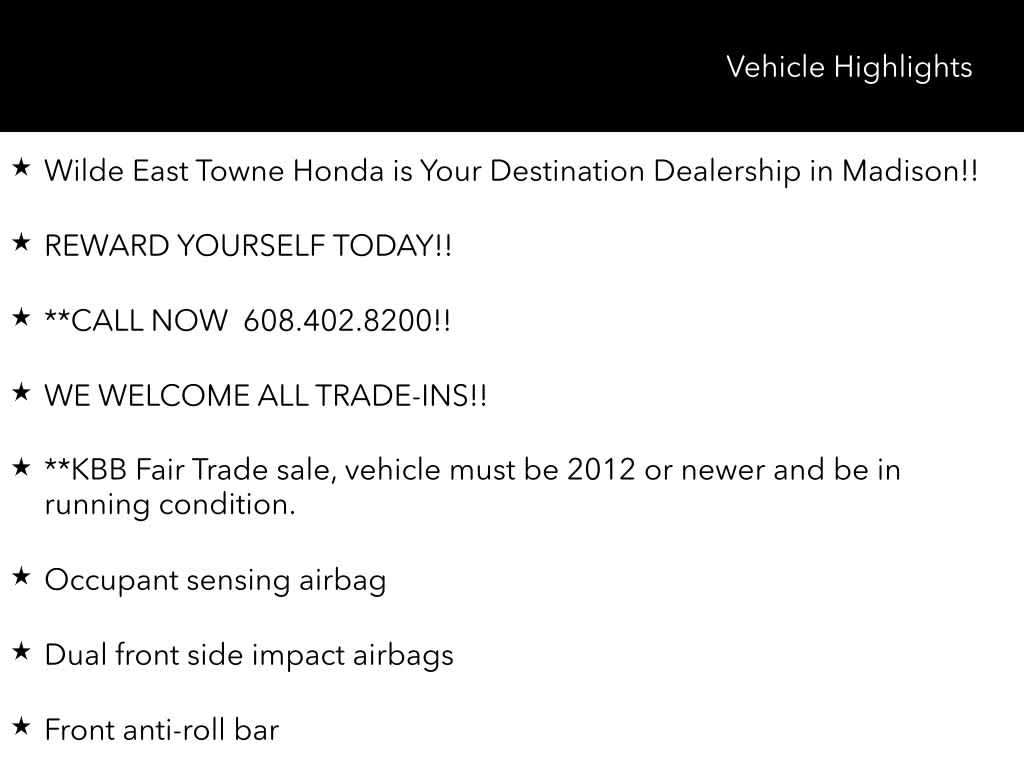 Wilde East Towne Honda is Your Destination Dealership in Madison!!, REWARD YOURSELF TODAY!!, **CALL NOW 608.402.8200!!, WE WELCOME ALL TRADE-INS!!, **KBB Fair Trade sale, vehicle must be 2012 or newer and be in running condition., Besides many of the features just listed, this Honda CR-V Hybrid also may have many of the following;, HondaTrue Certified Certified, 2.0L I4 DOHC 16V, Dual front impact airbags, Dual front side impact airbags, Front anti-roll bar, Knee airbag, Occupant sensing airbag, Overhead airbag, Rear anti-roll bar, Rear side impact airbag, 4-Wheel Disc Brakes, 4.438 Axle Ratio, 6 Speakers, ABS brakes, Adaptive Cruise Control: Adaptive Cruise Control (ACC) with Low-Speed Follow, Air Conditioning, Alloy wheels, Apple CarPlay/Android Auto, Auto High-beam Headlights, Automatic temperature control, Blind Spot Information (BSI) System warning, Brake assist, Bumpers: body-color, Cloth Seat Trim, Compass, Delay-off headlights, Driver door bin, Driver vanity mirror, Electronic Stability Control, Exterior Parking Camera Rear, Four wheel independent suspension, Front Bucket Seats, Front Center Armrest, Front dual zone A/C, Front reading lights, Fully automatic headlights, Heated door mirrors, Heated Front Bucket Seats, Heated front seats, Illuminated entry, Leather Shift Knob, Leather steering wheel, Low tire pressure warning, Outside temperature display, Overhead console, Panic alarm, Passenger door bin, Passenger vanity mirror, Power door mirrors, Power driver seat, Power moonroof, Power steering, Power windows, Radio data system, Radio: 240-Watt AM/FM Audio System, Rear reading lights, Rear seat center armrest, Rear window defroster, Rear window wiper, Remote keyless entry, Security system, Speed control, Speed-sensing steering, Speed-Sensitive Wipers, Split folding rear seat, Spoiler, Steering wheel mounted audio controls, Telescoping steering wheel, Tilt steering wheel, Traction control, Trip computer, Turn signal indicator mirrors, Variably intermittent wipers, Wheels: 18 Berlina Black Alloy, 2.0L I4 DOHC 16V, Dual front impact airbags, Dual front side impact airbags, Front anti-roll bar, Knee airbag, Occupant sensing airbag, Overhead airbag, Rear anti-roll bar, Rear side impact airbag.