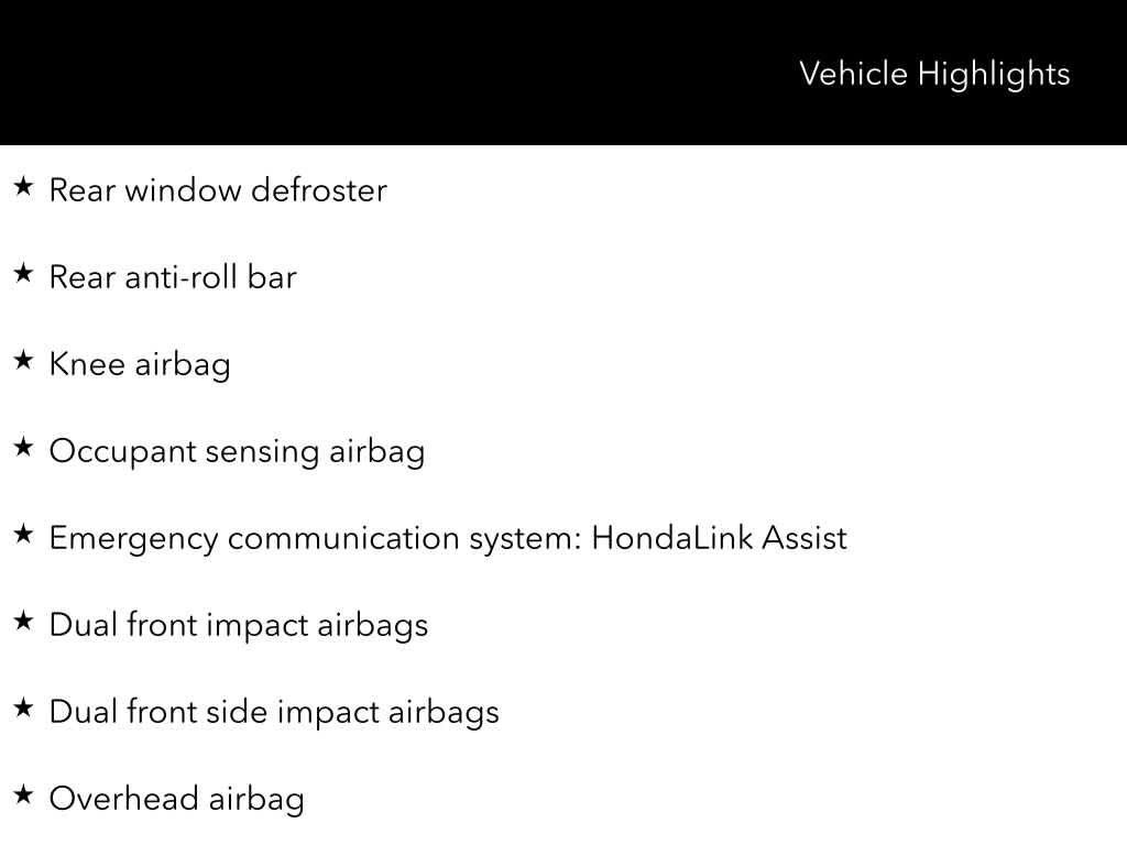 - Honda Care Roadside Assistance for 2 year/100,000 miles (whichever occurs first)