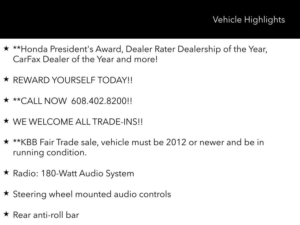 **Honda Presidents Award, Dealer Rater Dealership of the Year, CarFax Dealer of the Year and more!, REWARD YOURSELF TODAY!!, **CALL NOW 608.402.8200!!, WE WELCOME ALL TRADE-INS!!, **KBB Fair Trade sale, vehicle must be 2012 or newer and be in running condition., Besides many of the features just listed, this Honda Civic also may have many of the following;, HondaTrue Certified Certified, Black w/Cloth Seating Surfaces, Blind Spot Information (BSI) System warning, Emergency communication system: HondaLink, Exterior Parking Camera Rear, Front anti-roll bar, Knee airbag, Lane departure: Lane Keeping Assist System (LKAS) active, Occupant sensing airbag, Overhead airbag, Radio: 180-Watt Audio System, Rear anti-roll bar, Rear side impact airbag, Steering wheel mounted audio controls, 4-Wheel Disc Brakes, 8 Speakers, ABS brakes, Adaptive Cruise Control: Adaptive Cruise Control (ACC) with Low-Speed Follow, Air Conditioning, Alloy wheels, AM/FM radio, Apple CarPlay/Android Auto, Auto High-beam Headlights, Automatic temperature control, Brake assist, Bumpers: body-color, Cloth/Leatherette Seating Surfaces, Delay-off headlights, Driver door bin, Driver vanity mirror, Dual front impact airbags, Dual front side impact airbags, Electronic Stability Control, Four wheel independent suspension, Front Bucket Seats, Front Center Armrest, Front reading lights, Fully automatic headlights, Heated door mirrors, Illuminated entry, Leather Shift Knob, Low tire pressure warning, Outside temperature display, Panic alarm, Passenger door bin, Passenger vanity mirror, Power door mirrors, Power steering, Power windows, Radio data system, Rear window defroster, Rear window wiper, Remote keyless entry, Security system, Speed control, Speed-sensing steering, Split folding rear seat, Tachometer, Telescoping steering wheel, Tilt steering wheel, Traction control, Trip computer, Wheels: 18 Gloss Black Alloy, Black w/Cloth Seating Surfaces, Blind Spot Information (BSI) System warning, Emergency communication system: HondaLink, Exterior Parking Camera Rear, Front anti-roll bar, Knee airbag, Lane departure: Lane Keeping Assist System (LKAS) active, Occupant sensing airbag, Overhead airbag, Radio: 180-Watt Audio System, Rear anti-roll bar, Rear side impact airbag, Steering wheel mounted audio controls.