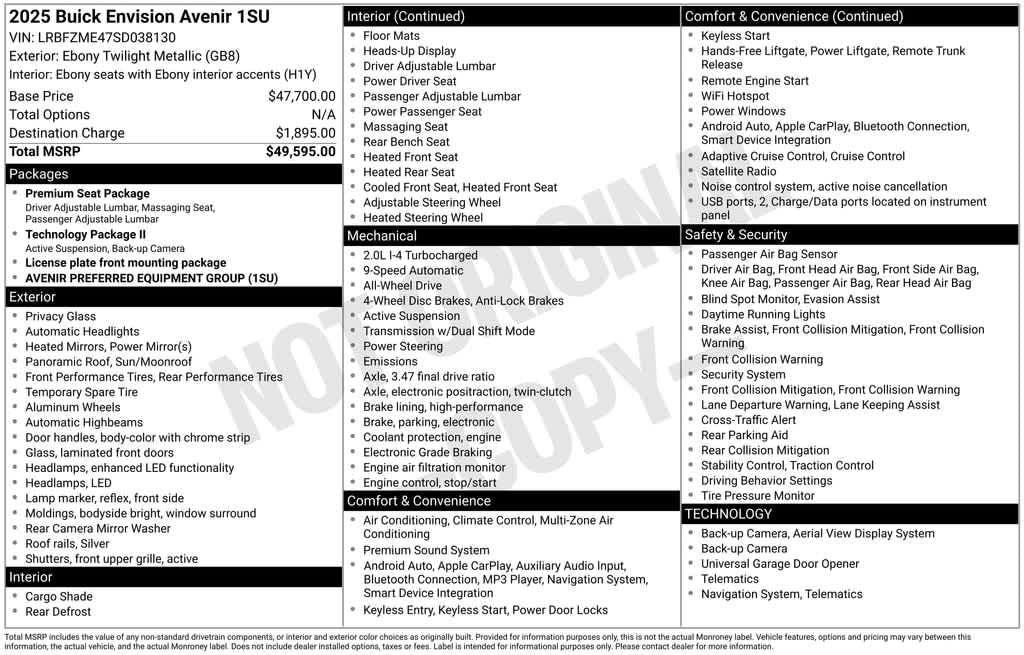 Researched 6 different competing compact luxury SUVs. Kept coming back to the Buick Envision Avenir. It looks great, descent gas mileage, nice interior, has quiet tuning and rides well. All at a lower price than the German alternatives. Built on a Cadillac XT4 frame and suspension with enhancements. It also received the Cadillac 2.0 L Turbo engine and 9 speed transmission that always puts the engine in the sweet spot of its torque curve. Also uses regular gas. A pleasure to drive. Buick hit a home run with this car.… - 5.0