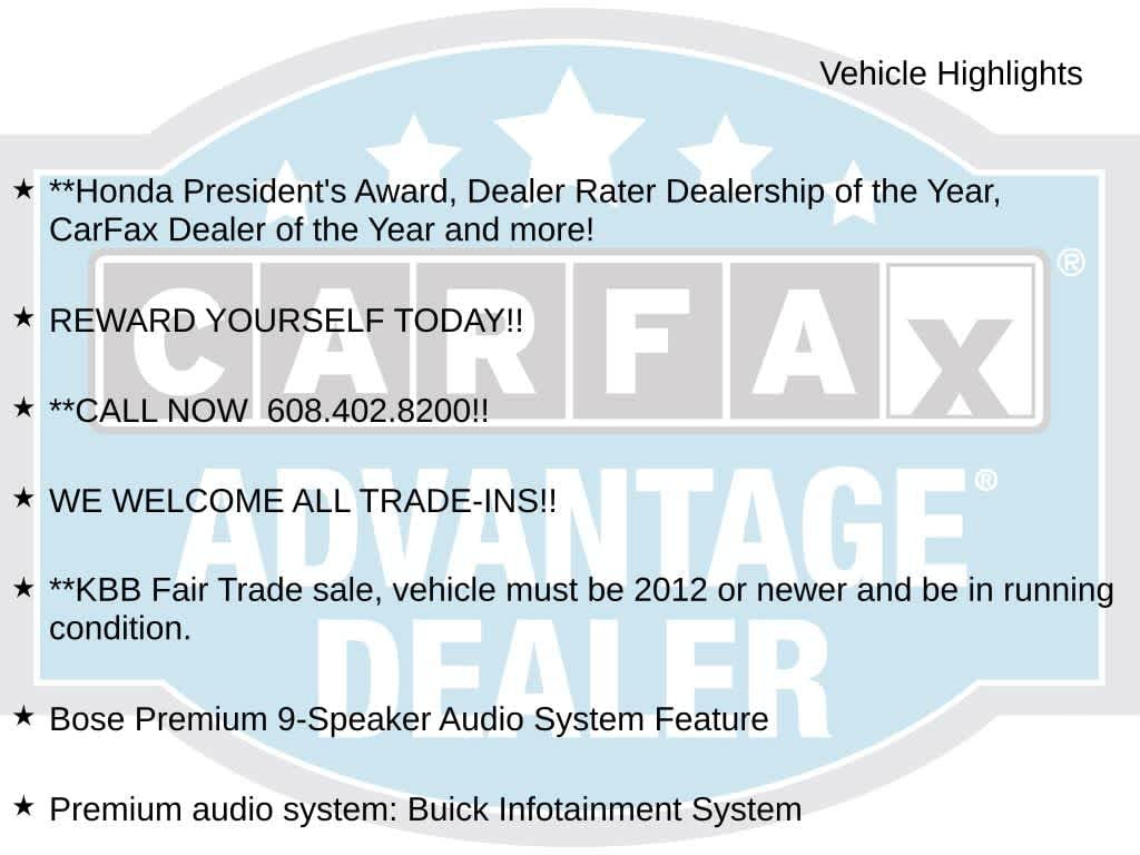 **Honda Presidents Award, Dealer Rater Dealership of the Year, CarFax Dealer of the Year and more!, REWARD YOURSELF TODAY!!, **CALL NOW 608.402.8200!!, WE WELCOME ALL TRADE-INS!!, **KBB Fair Trade sale, vehicle must be 2012 or newer and be in running condition., Besides many of the features just listed, this Buick Envision also may have many of the following;, Bose Premium 9-Speaker Audio System Feature, Premium audio system: Buick Infotainment System, 3.47 Final Drive Axle Ratio, 30 Diagonal LCD Display, 4-Wheel Disc Brakes, 9 Speakers, ABS brakes, Adaptive suspension, Air Conditioning, Alloy wheels, AM/FM radio: SiriusXM, Auto High-beam Headlights, Auto-dimming door mirrors, Auto-dimming Rear-View mirror, Automatic temperature control, Brake assist, Bumpers: body-color, Compass, Delay-off headlights, Driver 4-Way Power Lumbar Seat Adjuster, Driver 8-Way Power Seat Adjuster, Driver door bin, Driver Seat Massage Control, Driver vanity mirror, Dual front impact airbags, Dual front side impact airbags, Electronic Stability Control, Emergency communication system: OnStar and Buick connected services capable, Exterior Parking Camera Rear, Four wheel independent suspension, Front anti-roll bar, Front Bucket Seats, Front Center Armrest, Front dual zone A/C, Front Passenger 4-Way Power Lumbar Seat Adjuster, Front Passenger 8-Way Power Seat Adjuster, Front reading lights, Fully automatic headlights, Garage door transmitter, Heads-Up Display, Heated door mirrors, Heated Driver and Front Passenger Seats, Heated front seats, Heated rear seats, Heated steering wheel, Illuminated entry, Knee airbag, Leather steering wheel, Low tire pressure warning, Memory seat, Navigation System, Occupant sensing airbag, Outside temperature display, Overhead airbag, Overhead console, Panic alarm, Passenger door bin, Passenger vanity mirror, Power door mirrors, Power driver seat, Power Liftgate, Power moonroof, Power passenger seat, Power steering, Power windows, Preferred Equipment Group 1SU, Quilted and Perforated Leather-Appointed Seat Trim, Radio data system, Radio: Infotainment Center, Rear anti-roll bar, Rear reading lights, Rear seat center armrest, Rear window defroster, Rear window wiper, Remote keyless entry, Security system, SiriusXM Trial Subscription, Speed control, Split folding rear seat, Spoiler, Steering wheel mounted audio controls, Telescoping steering wheel, Tilt steering wheel, Traction control, Trip computer, Variably intermittent wipers, Ventilated Driver and Front Passenger Seats, Ventilated front seats, Wheels: 20 Alloy with Pearl Nickel Finish, Wireless Apple CarPlay/Wireless Android Auto, Bose Premium 9-Speaker Audio System Feature, Premium audio system: Buick Infotainment System.