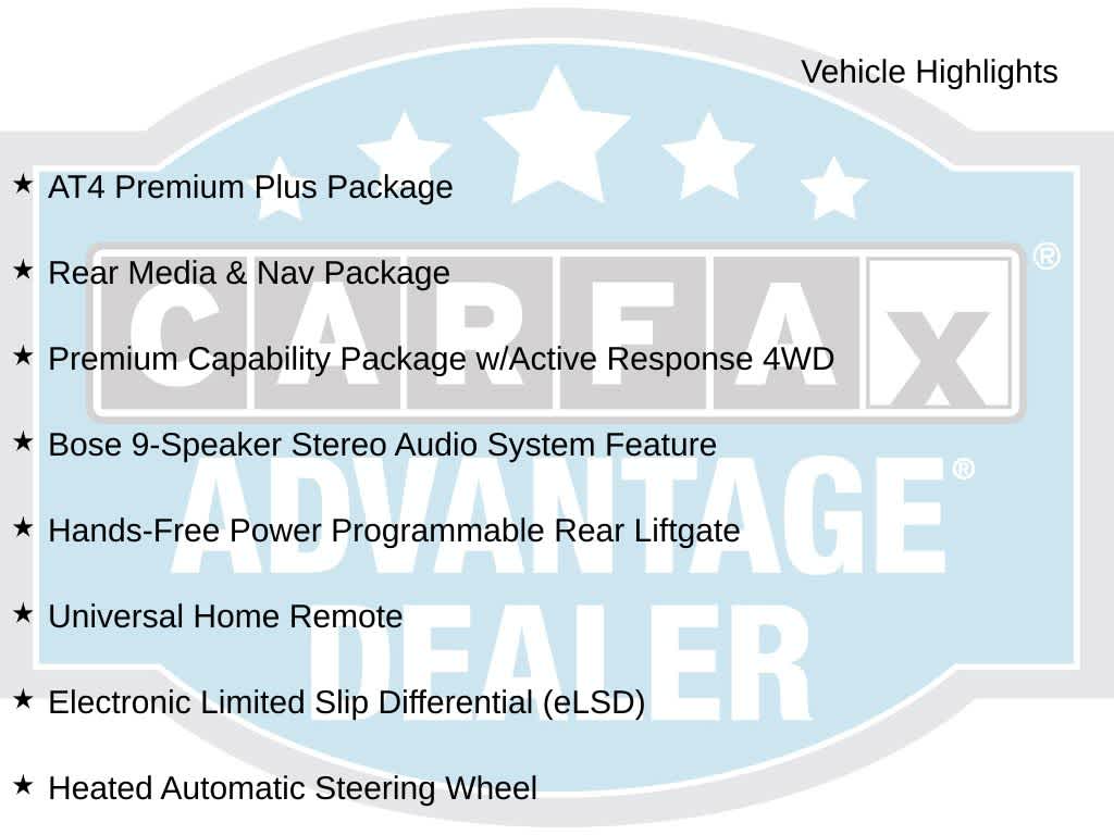 The Yukon XL AT4s premium features are designed to elevate your driving experience. Enjoy the convenience of the Hands-Free Power Programmable Rear Liftgate, the comfort of the Heated Automatic Steering Wheel, and the exceptional ride quality of the Magnetic Ride Control Suspension. The Bose 9-Speaker Stereo Audio System and the Dual-Pane Panoramic Power Sunroof will captivate your senses, while the Electronic Limited Slip Differential (eLSD) and Hill Descent Control provide unparalleled capability.
