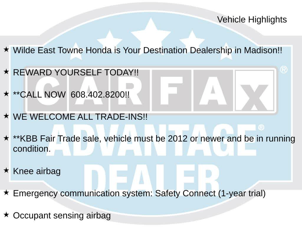 We would like to invite you out to Wilde East Towne Honda where you will experience a higher level of customer service. Exceptional service care that has helped us earn some prestigious awards. Honda President??s Award. Hondas highest level of achievement. DealerRater Dealer of the Year. Carfax customer service dealership of the year. Our family friendly staff look forward to serving all your automotive needs. Located on Madison??s East Side, we are just 2 miles South of Sun Prairie off Hwy 151/90/94. Some vehicles may be subject to manufacturer safety recalls that, for various reasons, may not be repaired prior to sale. You may also check for open recalls at www.safercar.gov.